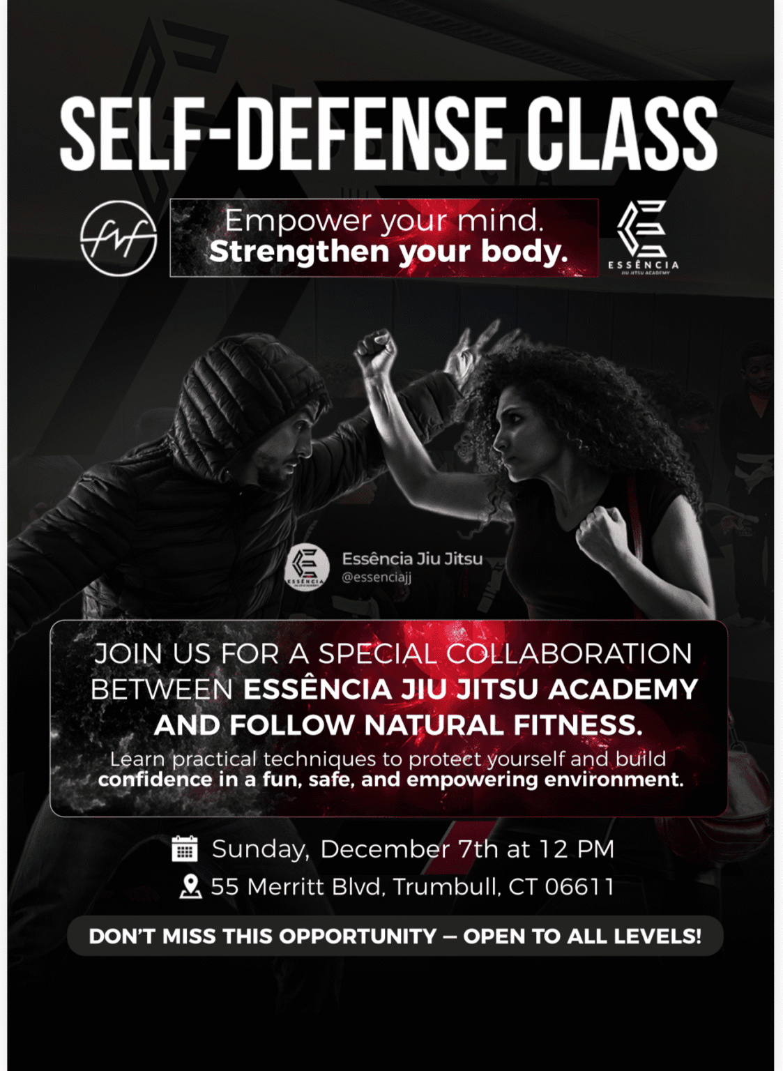 Join us for a powerful, one-day collaboration event between Essência Jiu Jitsu Academy and Follow Natural Fitness. This class is designed to give you the fundamental tools and practical techniques necessary to protect yourself and your loved ones.