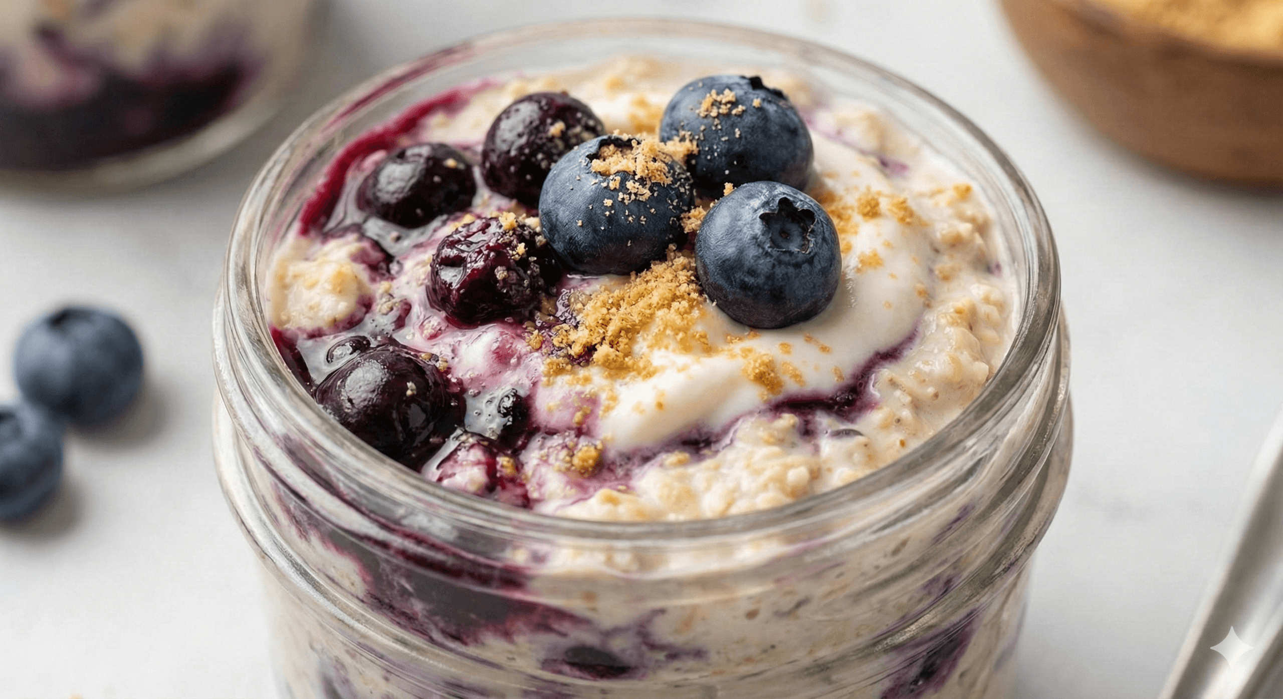Delicious overnight oats featuring a vibrant blueberry cheesecake flavor profile.