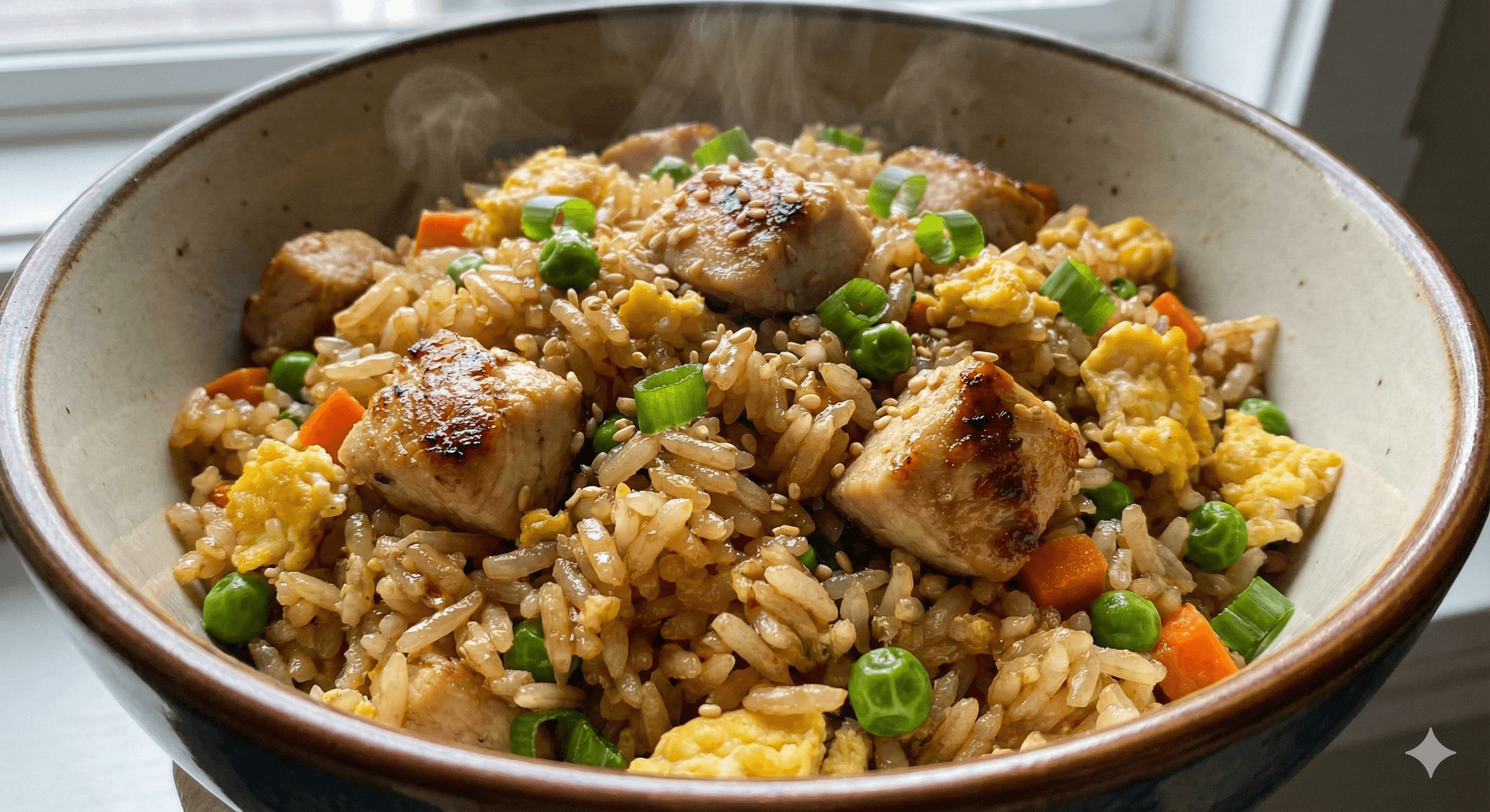 Tender, juicy chicken breast pieces sautéed with fluffy jasmine rice.