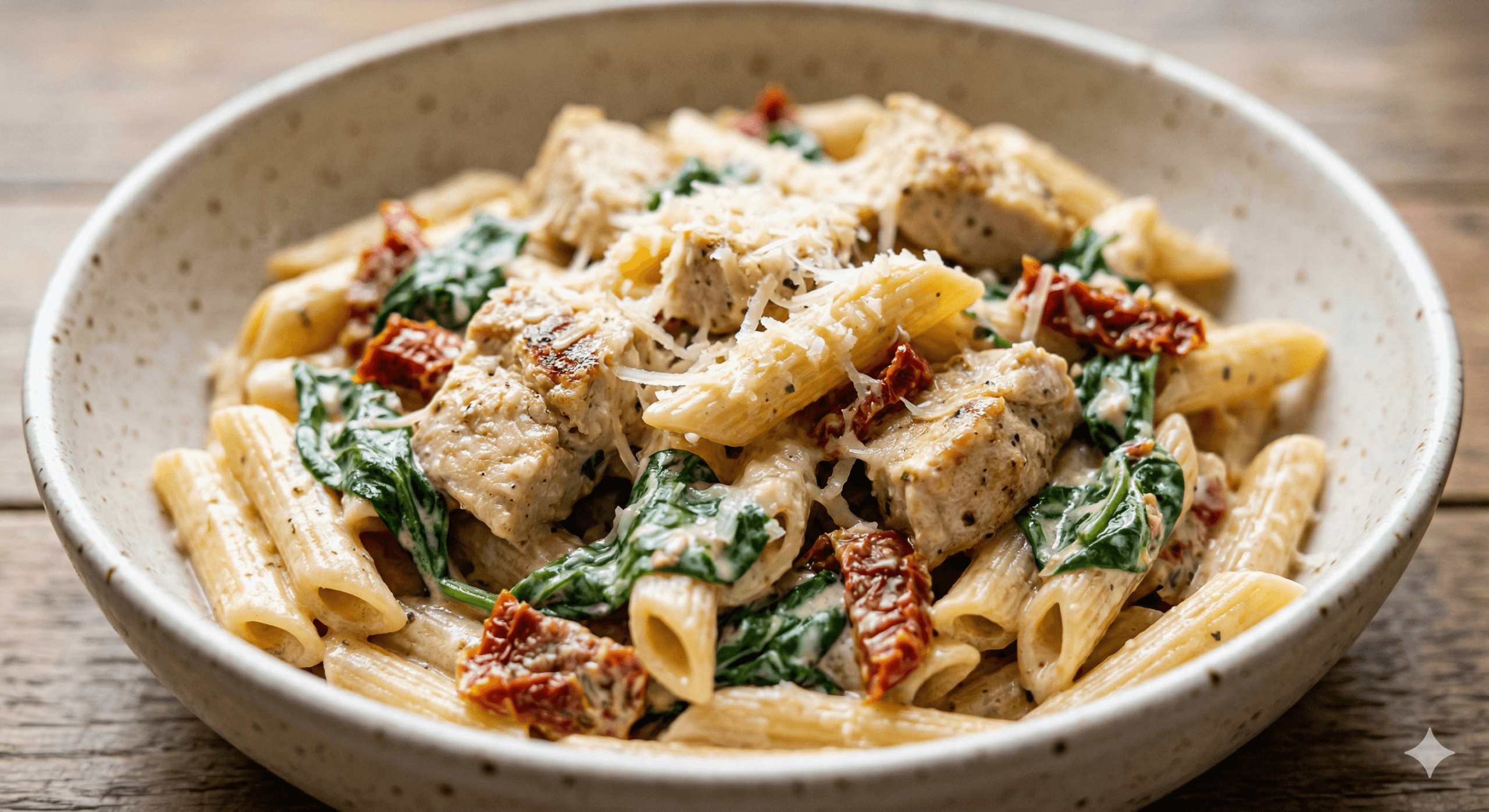 Creamy penne with grilled chicken, sun-dried tomatoes, and fresh spinach.