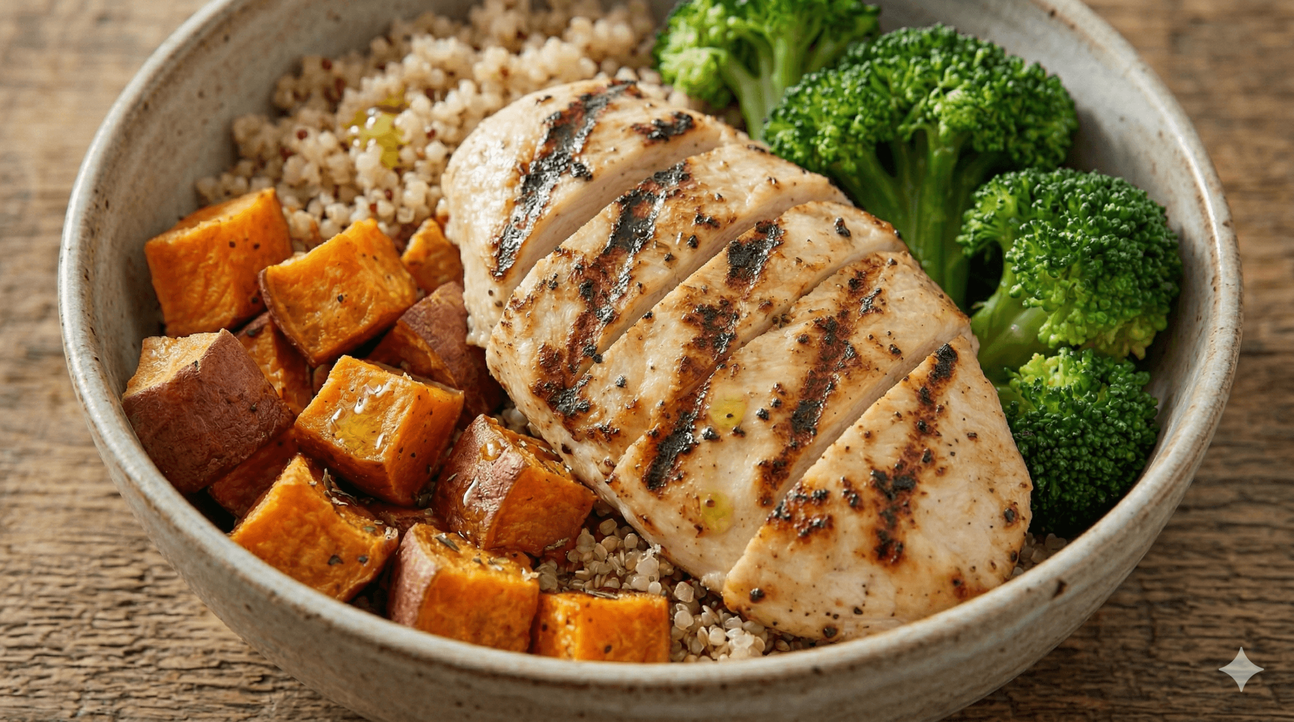 A nutrient-dense bowl featuring juicy grilled chicken, roasted sweet potatoes, and steamed broccoli served over a bed of fluffy quinoa.