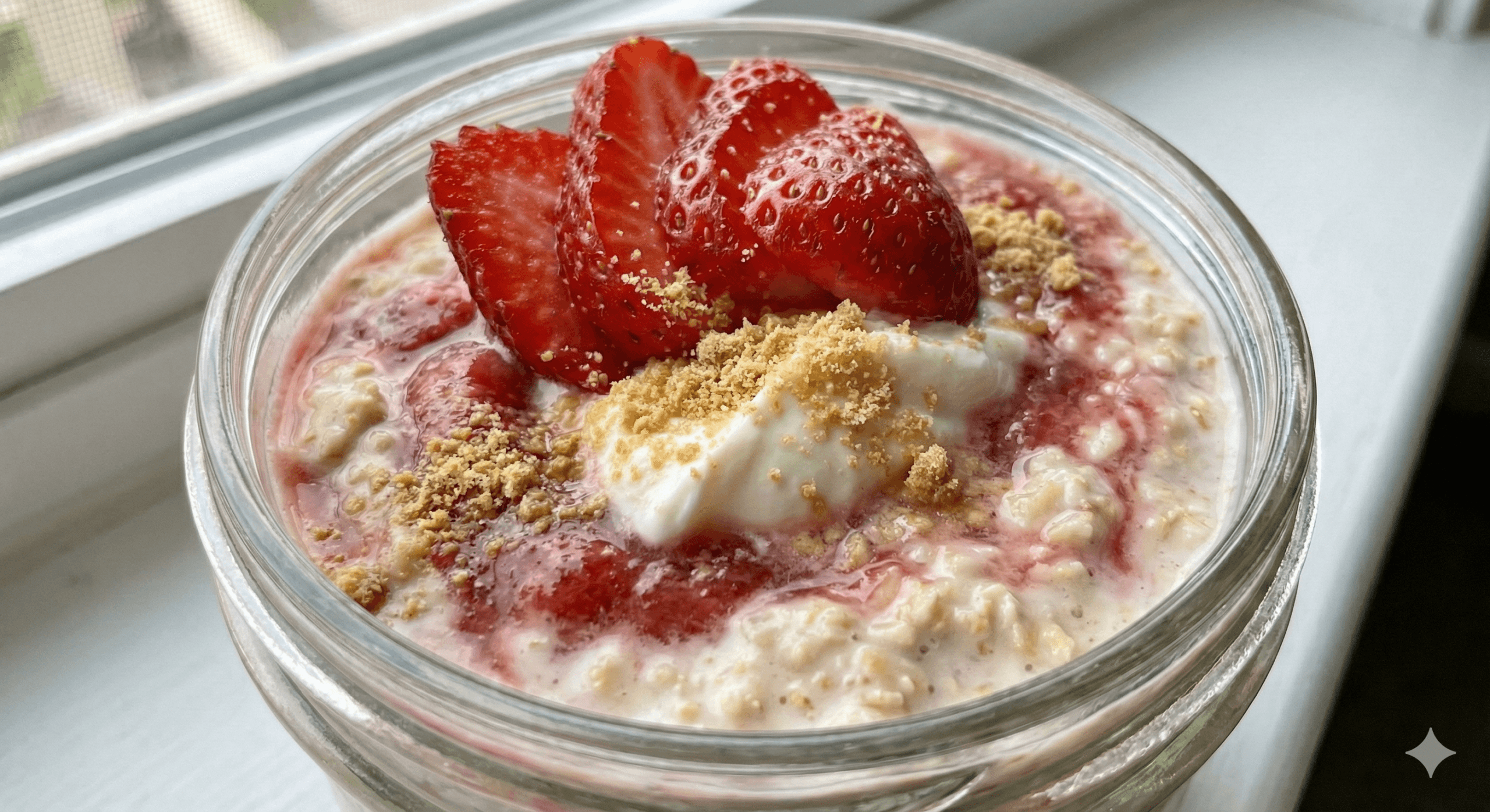 Creamy overnight oats inspired by strawberry cheesecake for a sweet, protein-filled start to your day.