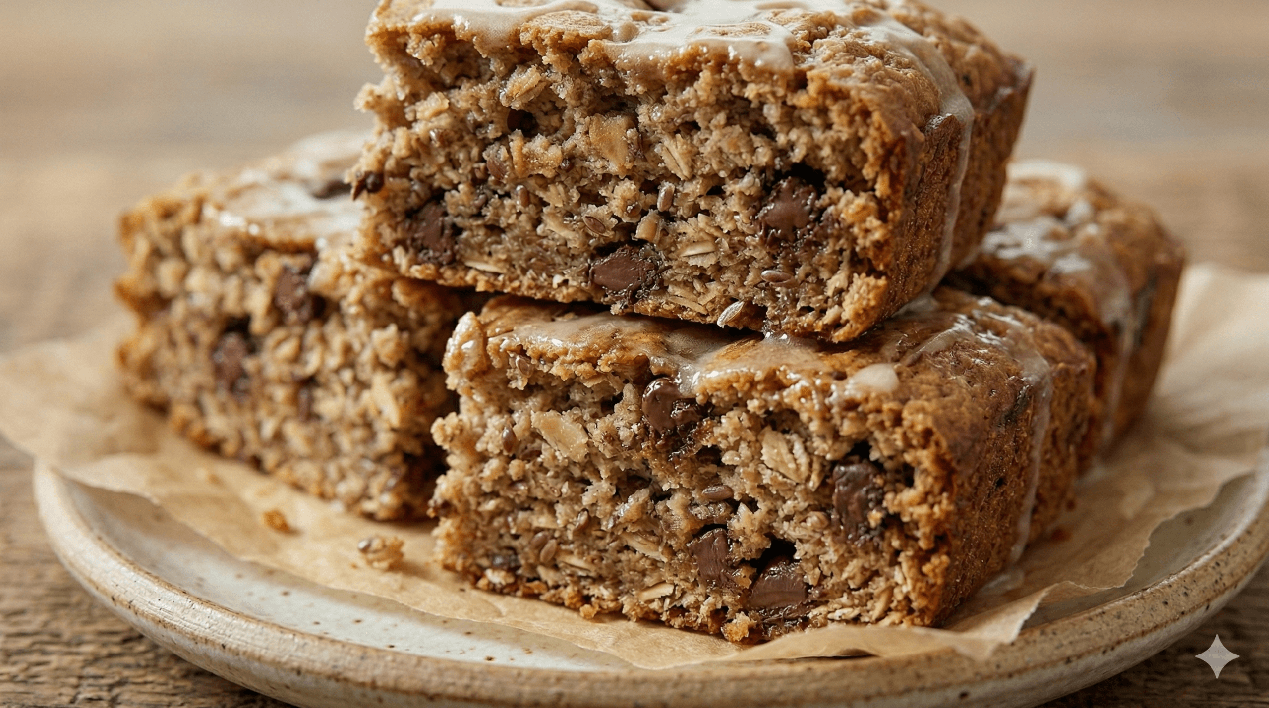 Moist, protein-infused banana bread squares packed with rolled oats and chocolate chips for a perfectly balanced, guilt-free treat.