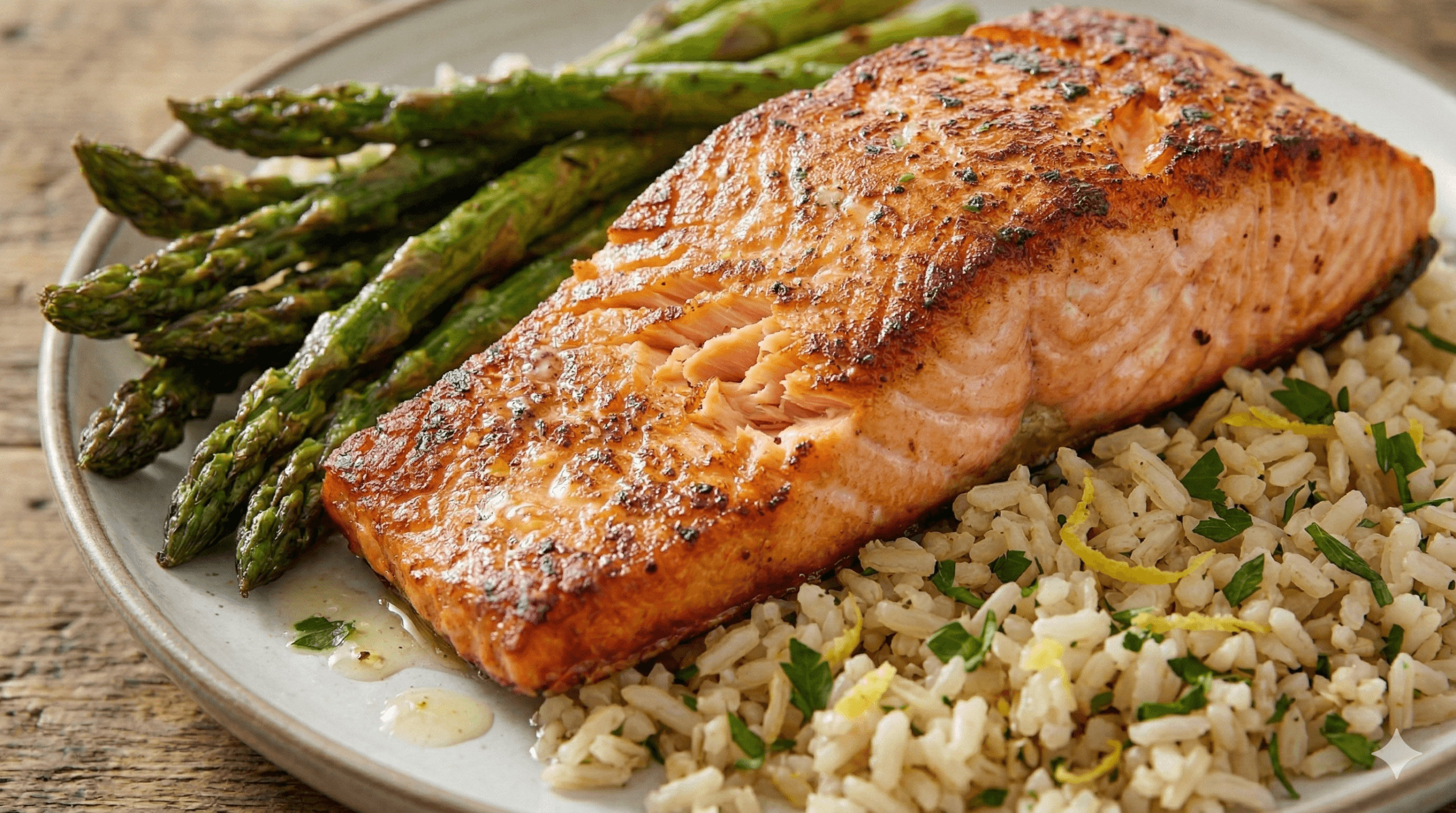 A perfectly seared salmon fillet paired with crisp roasted asparagus and fiber-rich brown rice for clean, sustained energy.
